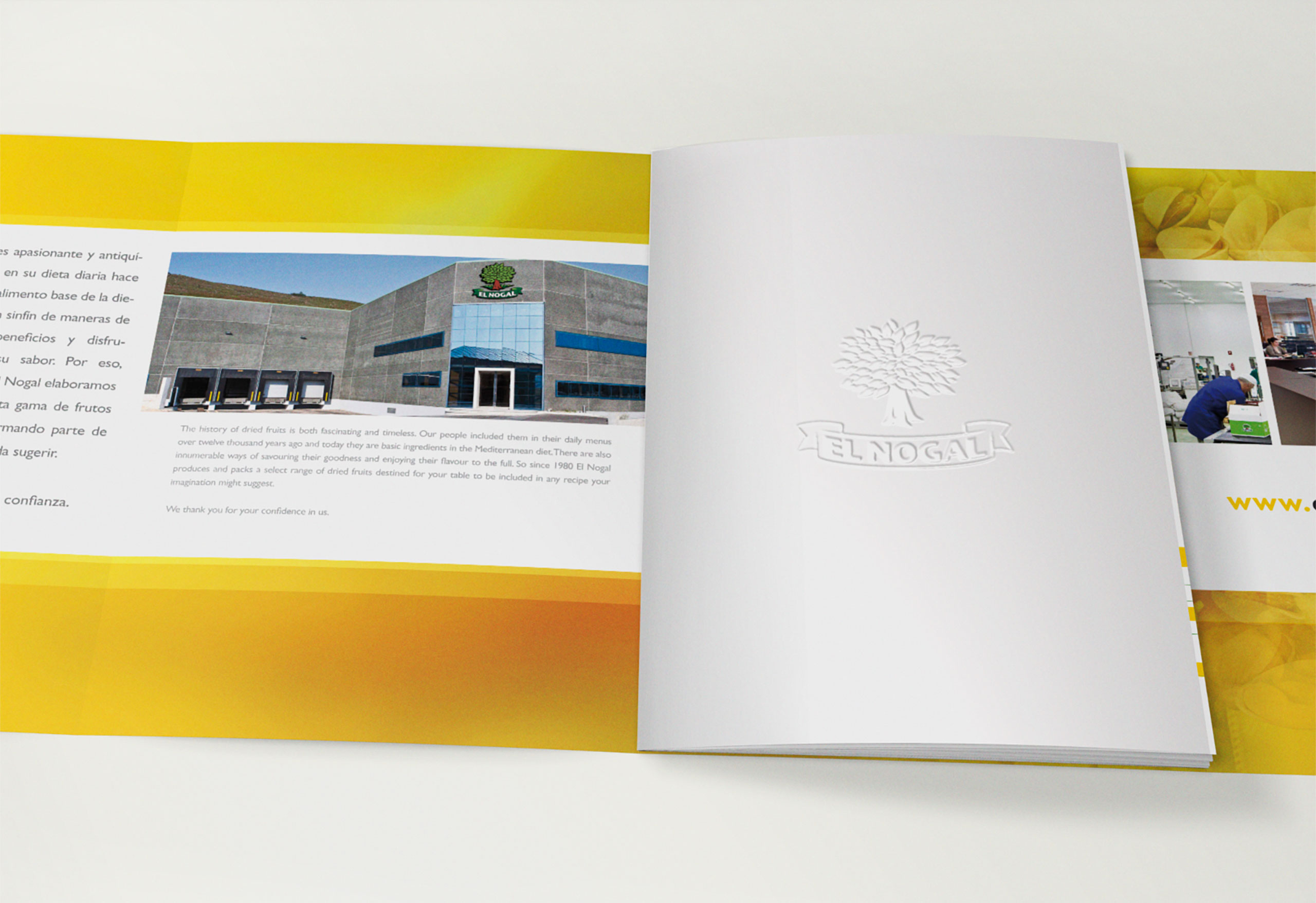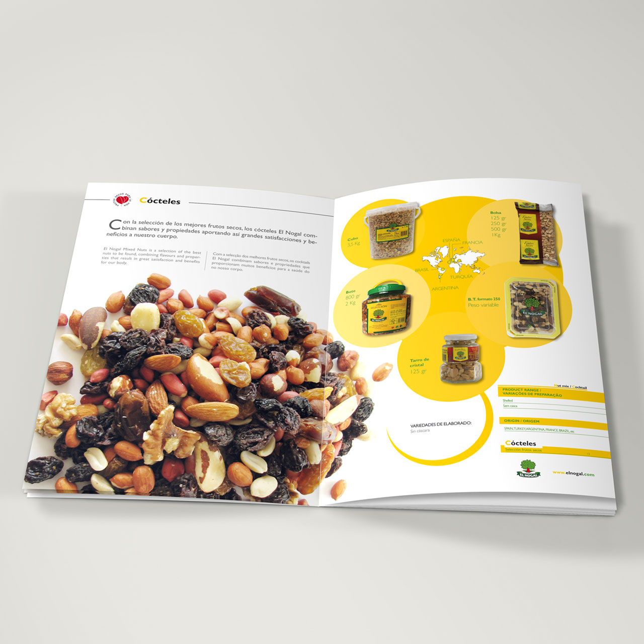 El Nogal es una conocida marca de frutos secos cuya empresa nace en 1980 en la localidad de Campo Lameiro en la comarca de Pontevedra y que a lo largo de las siguientes décadas fue consolidando su éxito dentro del mercado de los frutos secos y los snacks, estando presentes sus productos en una amplia variedad de superficies comerciales del sector alimentario de toda España. A lo largo de la década del 2000 los cambios económicos, sociales y de hábitos de consumo además de un entorno competitivo cada vez más agresivo obligan a abordar un plan estratégico acorde con este contexto tan complejo. El catálogo se diseña y se desarrolla dentro de este marco y será en cierta manera precursor de una renovación total de la marca y de su gama de productos.